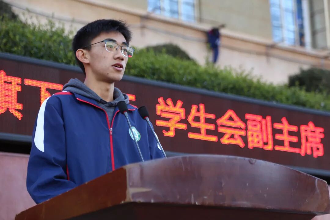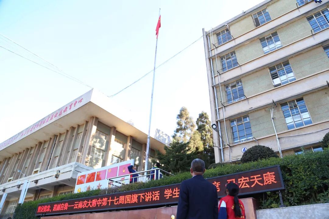 12月23日上午,云南农业大学附属中学举行本学期第十七周升旗仪式。在升旗后,学生会副主席马宏天康为师生们带来了题为《坚定信念·超越自我》的主题演讲,马宏天康同学希望大家能够拥有坚定不移的信念,才能看到成功的方向。接着,值日校长对当天初高中的早读、课堂、校园卫生等情况作了总结。之后,由丁春和校长对本周高效学习纪律安全优秀班级进行授旗仪式。